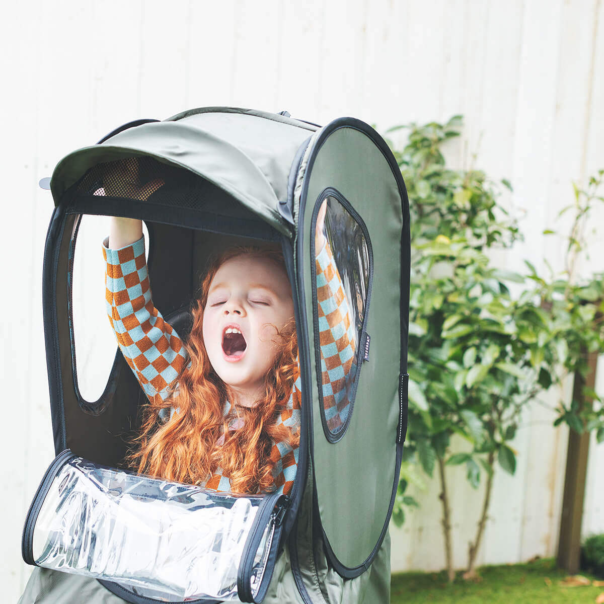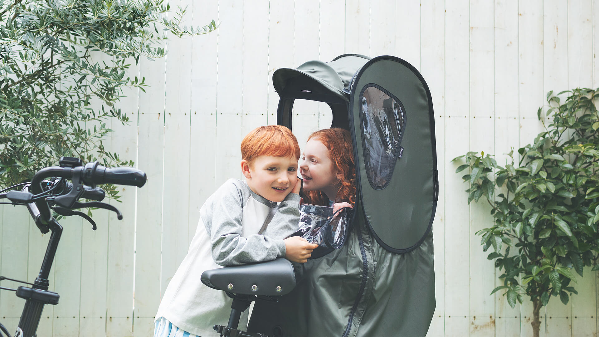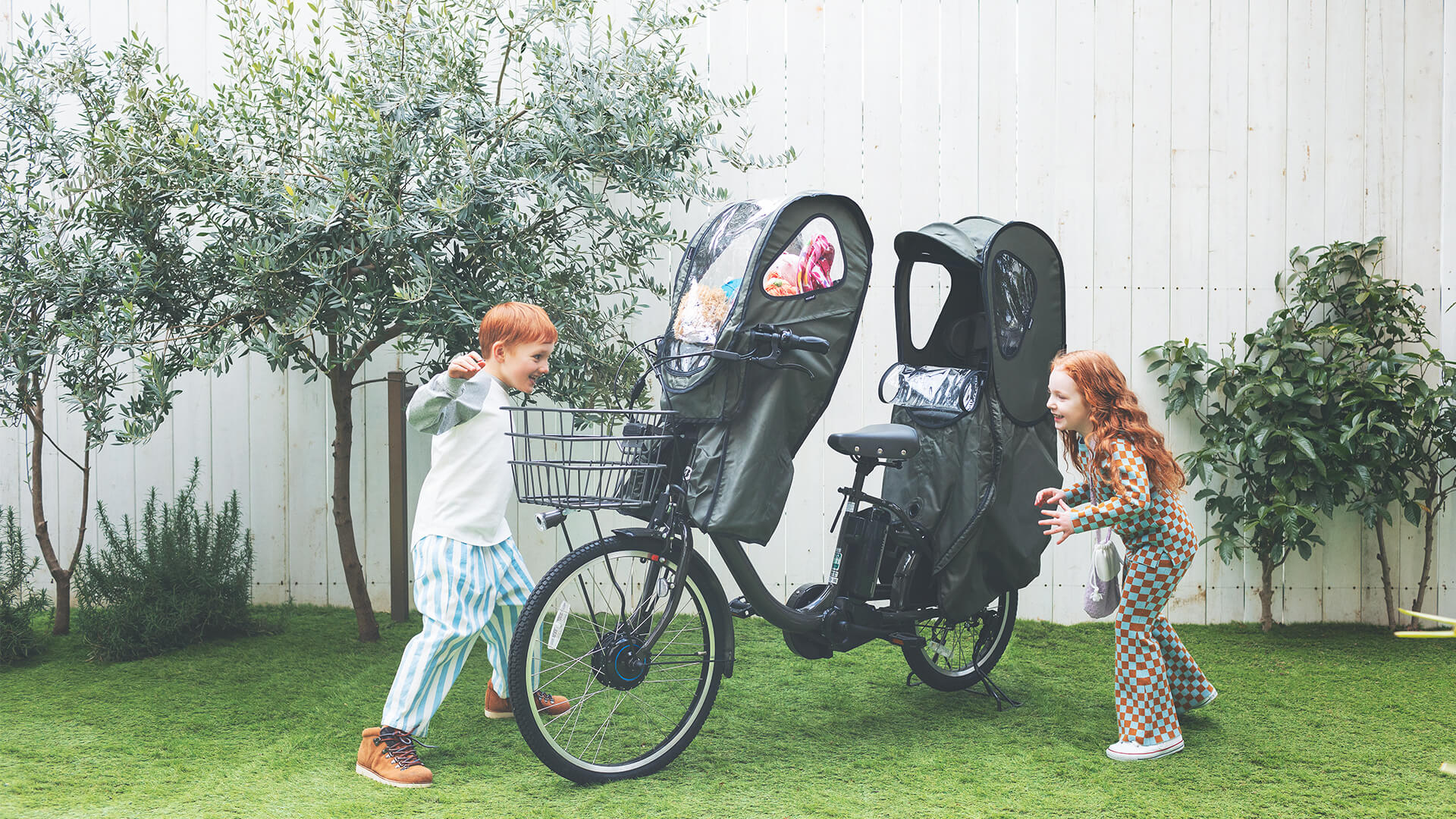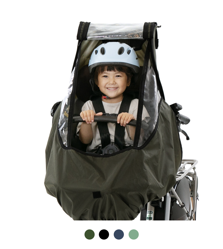 送迎後も楽々!クルッと畳んで、自転車にパチっと取付け。防風/撥水仕様。