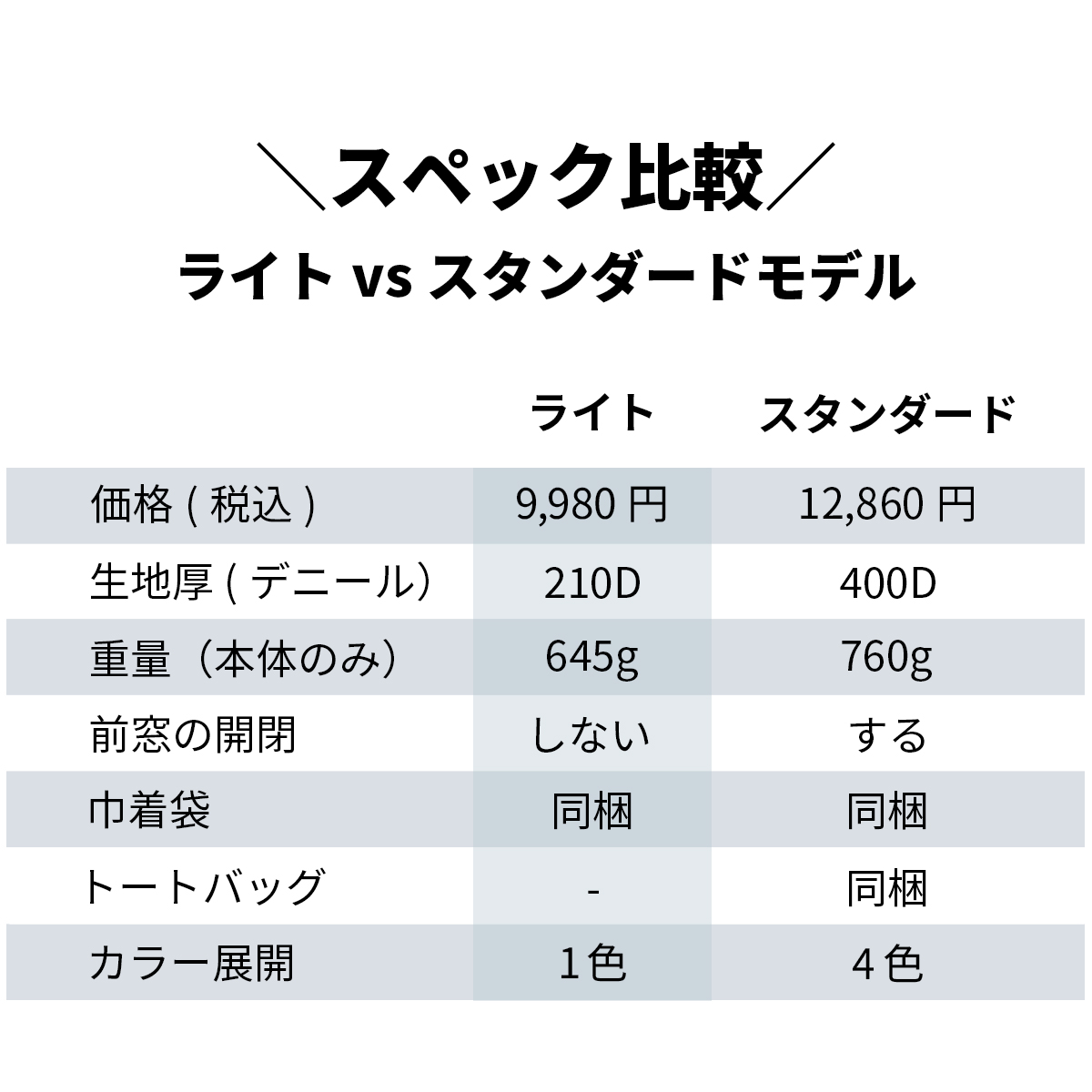ライトモデルは、スタンダードモデルと比べ、薄手生地を採用することで軽量かつ畳みやすく、携帯するのに最適。前窓が開かないシンプル設計に、持ち運び用の巾着袋のみ同梱することで、お値段もお手頃に。