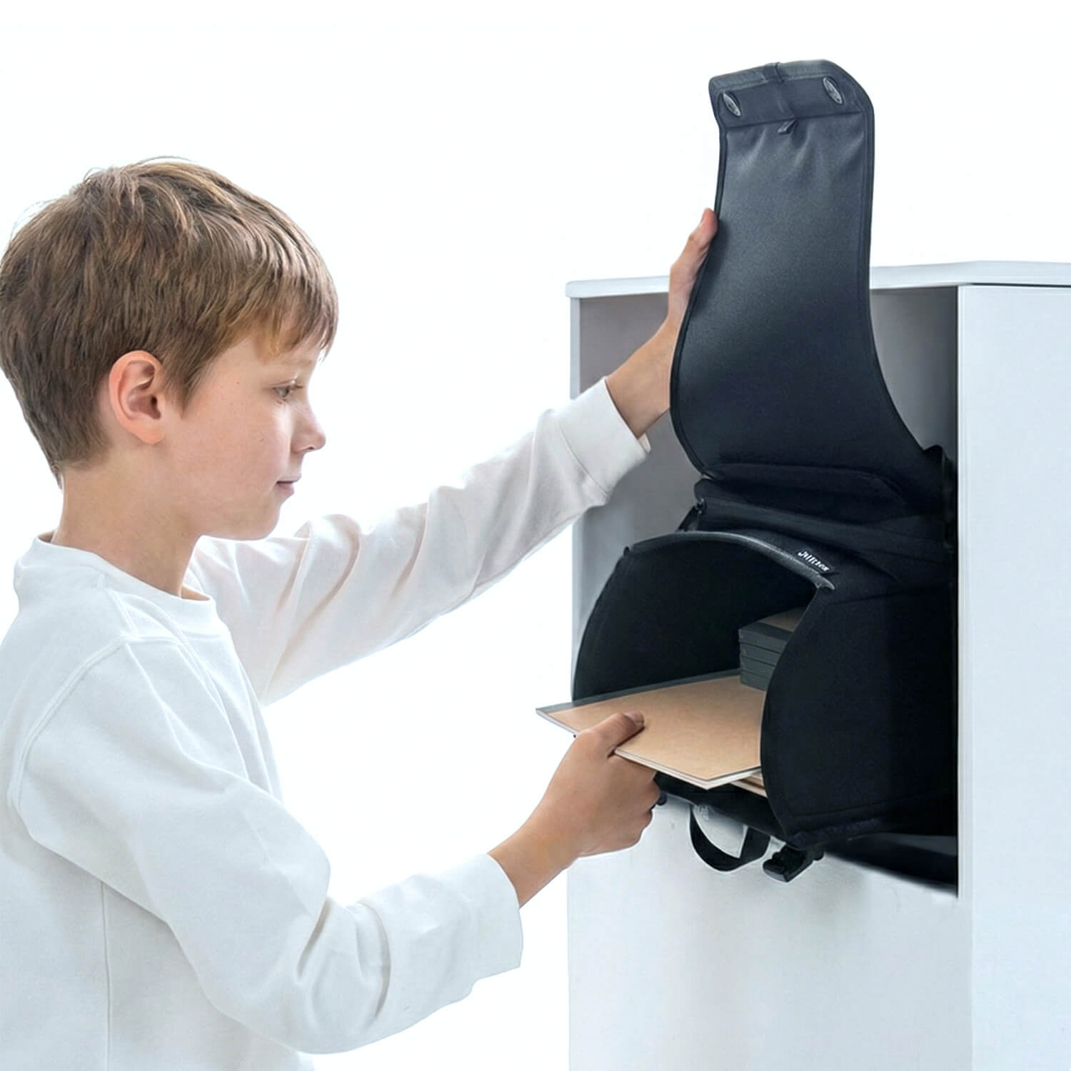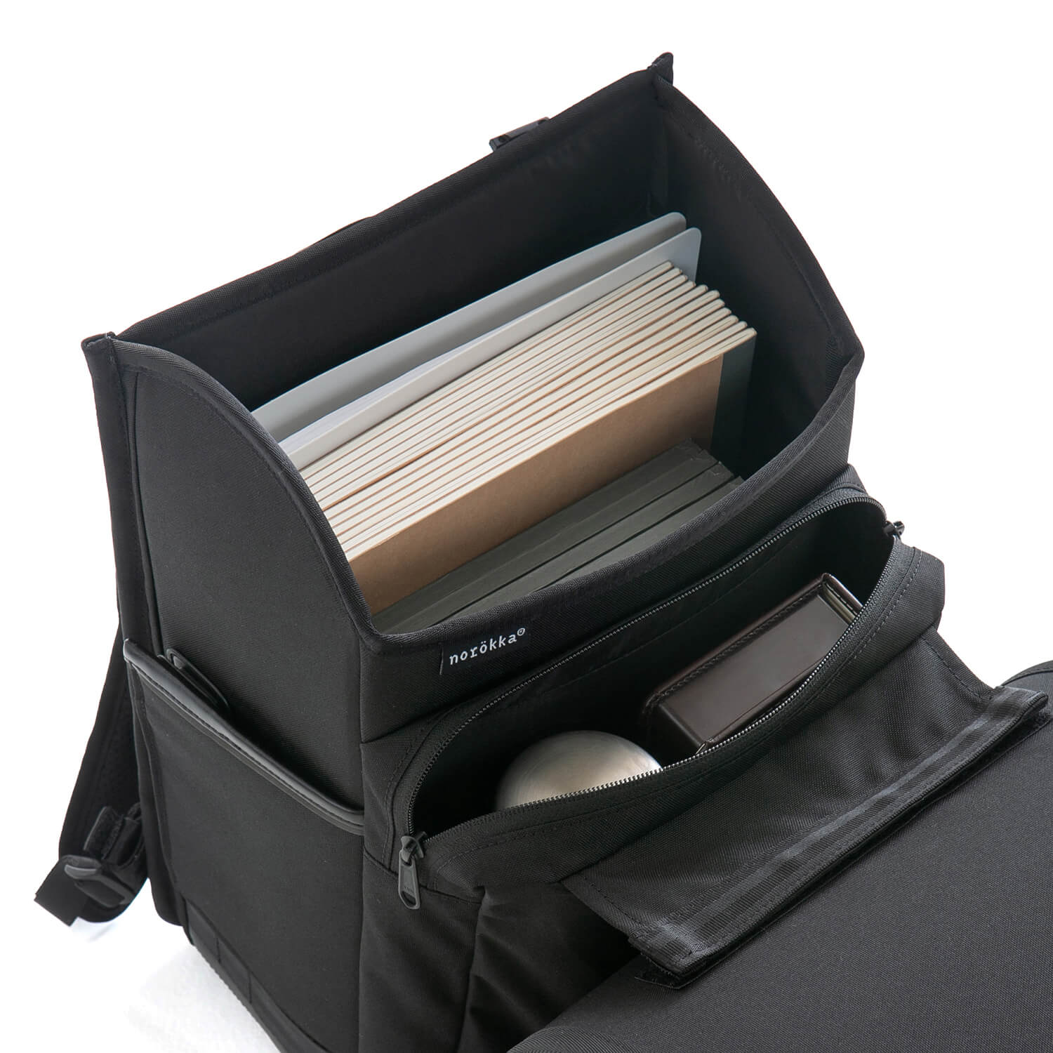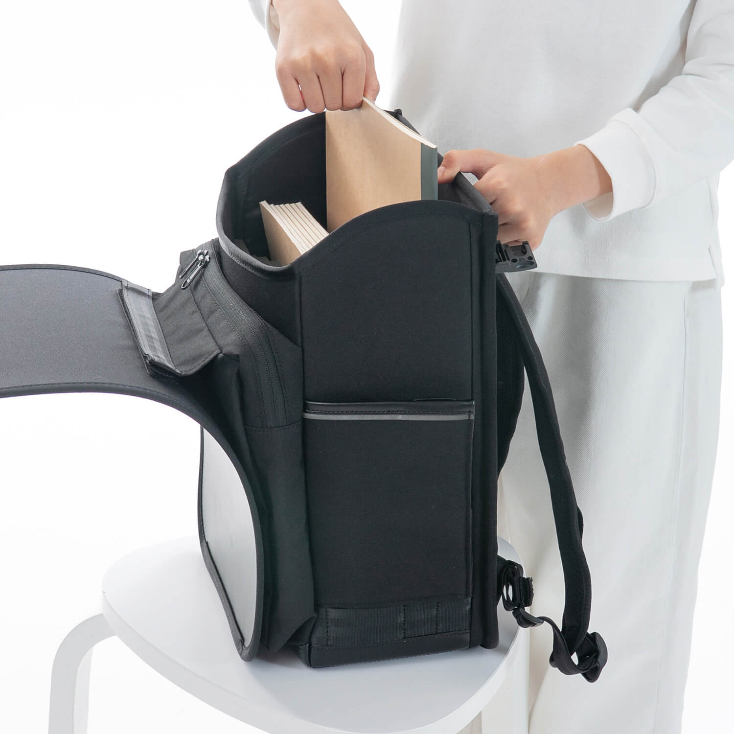 上からフラップを開閉する新スタイル。机の上でも、背負っていても、パッと出し入れ。