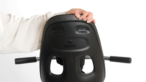 チャイルドシートの肩ベルト穴の留具を外します。ベルト式ヒネリ留具のマジックテープ両端をそこに差し込み、しっかりと固定します。